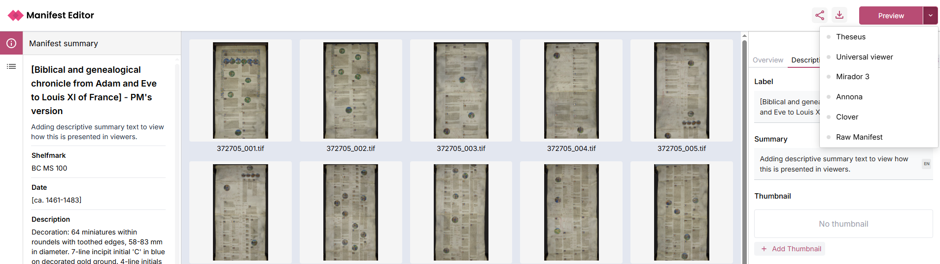 To view your changes, you can preview those changes in a number of viewers that are configured within the Manifest Editor, including Universal Viewer, Mirador, Theseus and others.